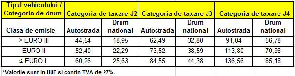 Incepand cu 1 ianuarie 2015 in Ungaria s-au facut anumite majorari la taxele de drum din Ungaria, tarifele practicate pentru plata taxelor de drum fiind modificate cu aproximativ 5%. Noile tarife aplicate in sistemul HU-GO le regasiti in tabelul de mai jos: